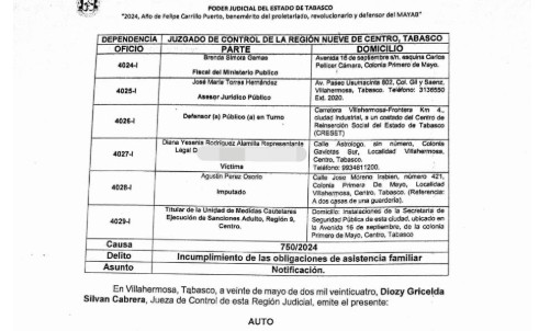 La Fiscalía General del Estado (FGE) mantiene una investigación por incumplimiento de obligaciones de asistencia familiar en contra del señor Agustín Pérez Osorio, de acuerdo al expediente 1671/2024 y radicado en el Poder Judicial con el número de causa 750/2024.