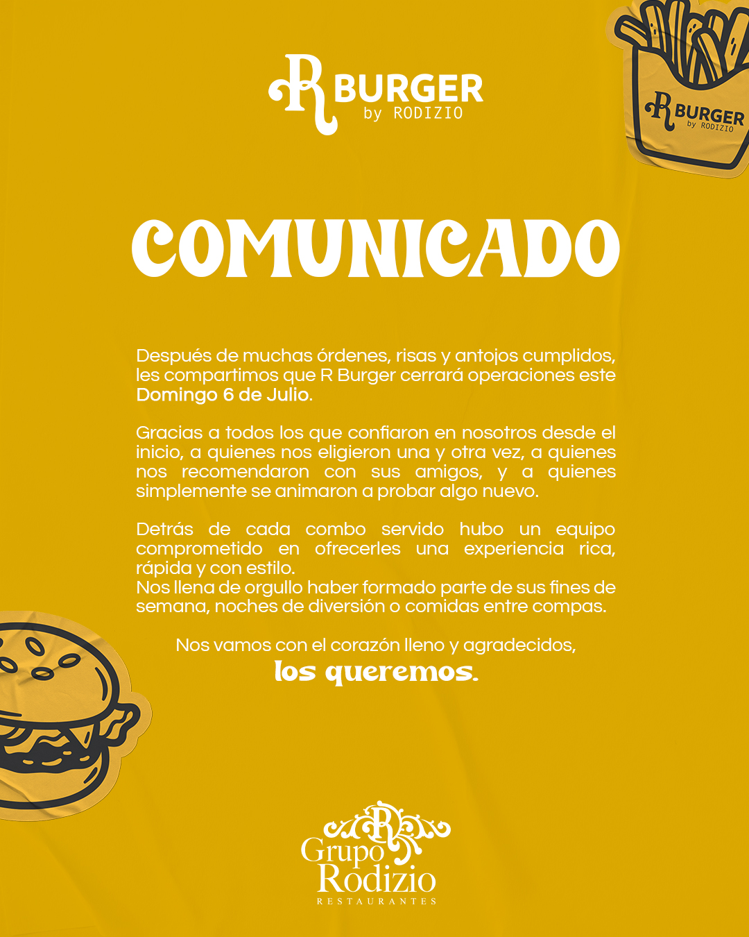Más adelante, se anunció el cierre de R Burger, del mismo grupo Rodizio, enfocado a la venta de hamburguesas y snacks, cuyo modelo de operación era a través de aplicaciones digitales.