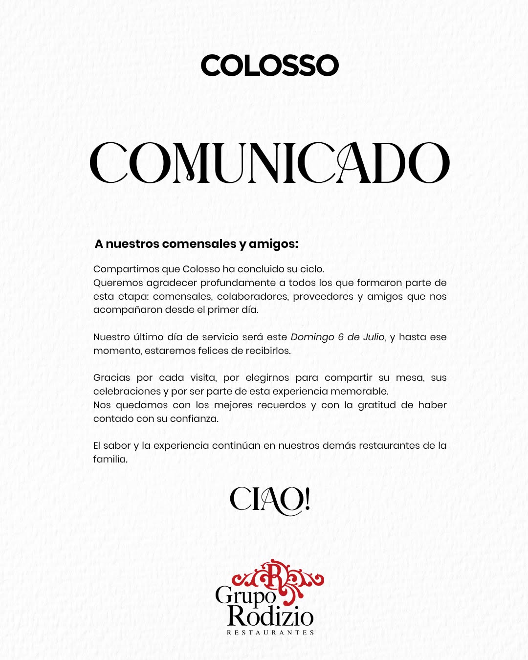 A través de un comunicado dado a conocer en las redes sociales de la firma, el grupo Rodizio -administrador de Colosso- informa que será este domingo 6 de julio cuando se preste servicio por última vez a los comensales, gustosos de la gastronomía italiana a la cual se enfocó el restaurante.