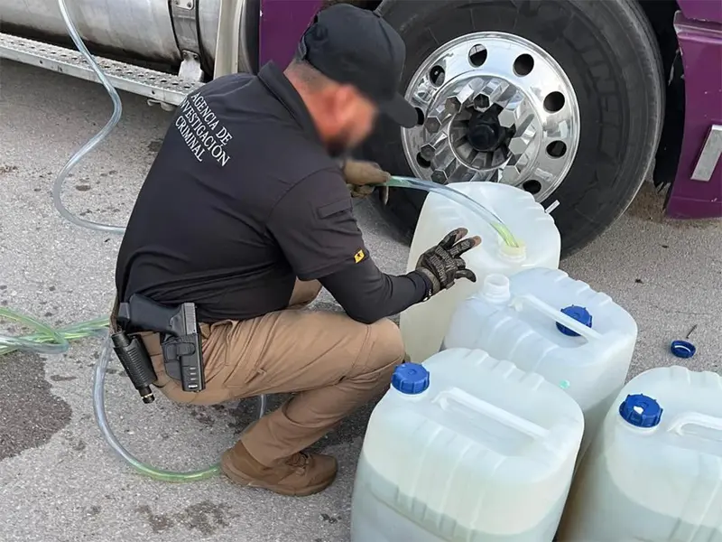 En el interior fueron encontrados cinco bidones con capacidad de 50 litros cada uno, que contenía una sustancia líquida similar a la heroína líquida, por lo que el conductor de 35 años de edad fue detenido.