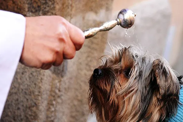 Con la ayuda de un monaguillo, el presbítero se acercó a la entrada de la Catedral para bendecir a los animales, mientras los fieles formaban una fila para que ninguno quedara sin la bendición.