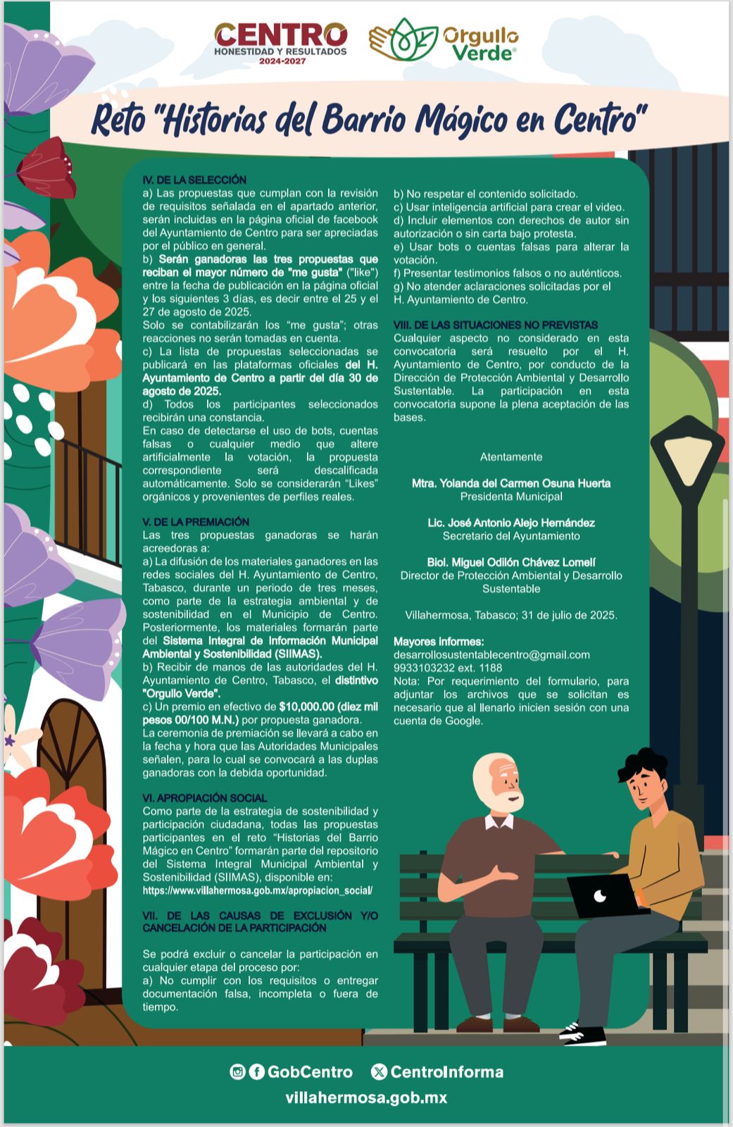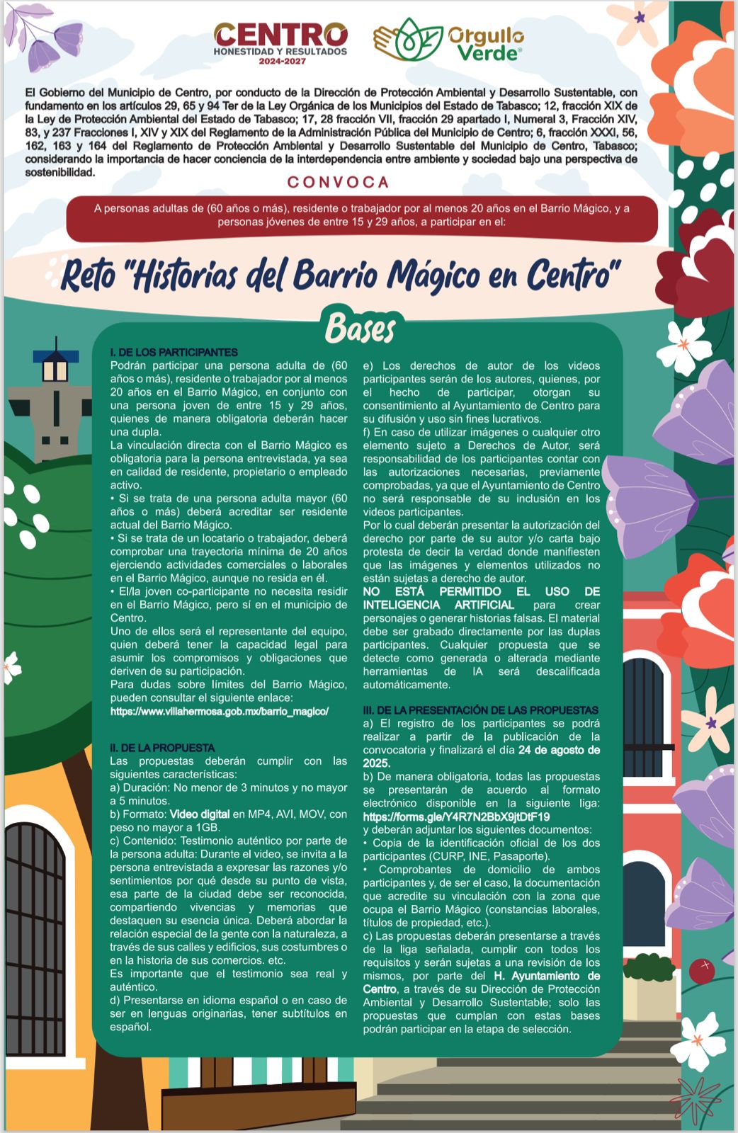 El Gobierno de Centro convoca al Reto “Historias del Barrio Mágico en Centro”, una oportunidad para compartir vivencias y recuerdos sobre la naturaleza, calles, edificios, costumbres y comercios del Barrio Mágico Zona Luz de Villahermosa, a través de un video. La fecha límite para enviar las propuestas es el 24 de agosto.