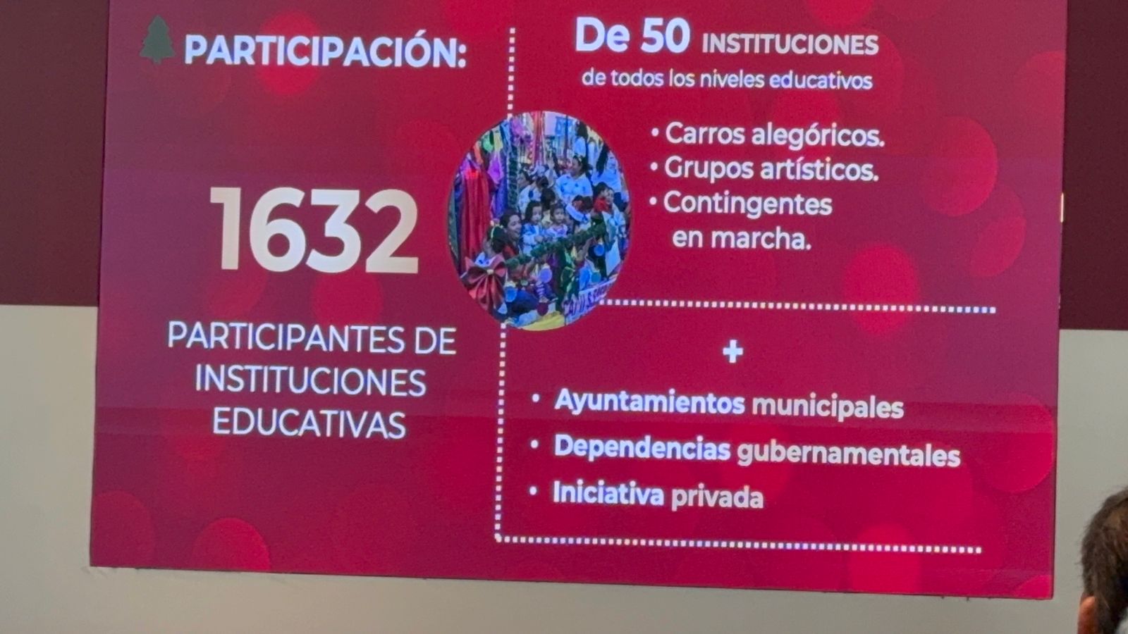 De acuerdo con el reporte oficial, detalló que el desfile contó con la participación de mil 632 personas, entre alumnas, alumnos, docentes, madres y padres de familia, pertenecientes a 50 instituciones educativas de los niveles inicial, preescolar, preescolar indígena, educación especial, primaria, secundaria, misiones culturales, escuelas de oficio, CEBAS, educación media superior y superior.
