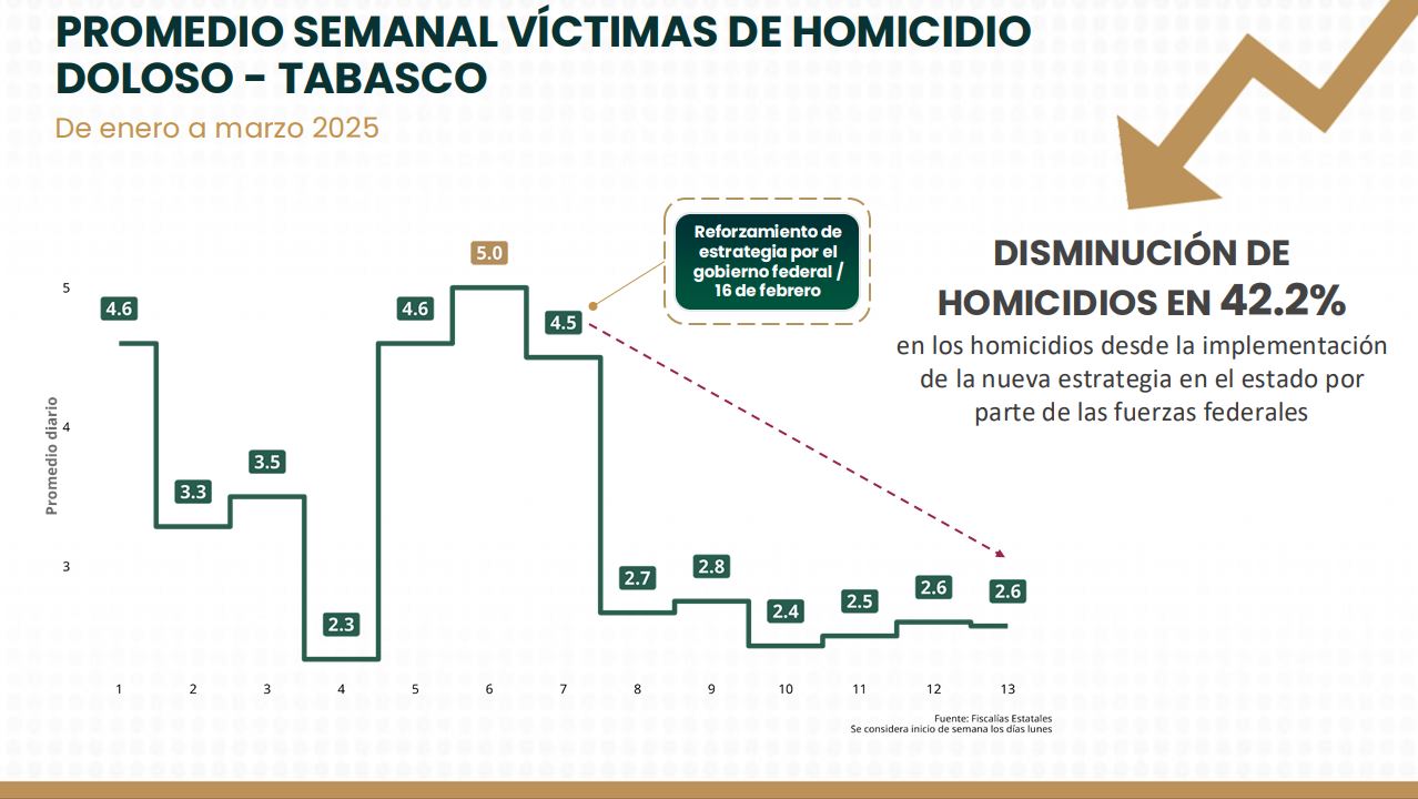 Al mismo tiempo, la secretaria Ejecutiva del Sistema Nacional de Seguridad Pública, Marcela Figueroa Franco, presentó el análisis semanal diario de víctimas, que señala que en las primeras semanas del presente año se alcanzaron cifras de hasta cinco víctimas diarias en Tabasco. “Pero a partir de la semana 7, el 16 de febrero, se hizo un reforzamiento en la estrategia de seguridad por parte del gobierno federal en la entidad, acompañado por instituciones estatales, y marca claramente un punto de inflexión en la tendencia, pues se observa una reducción sostenida, que se ha estabilizado en niveles cercanos a 2.6 víctimas diarias al cierre del primer trimestre”, enfatizó.