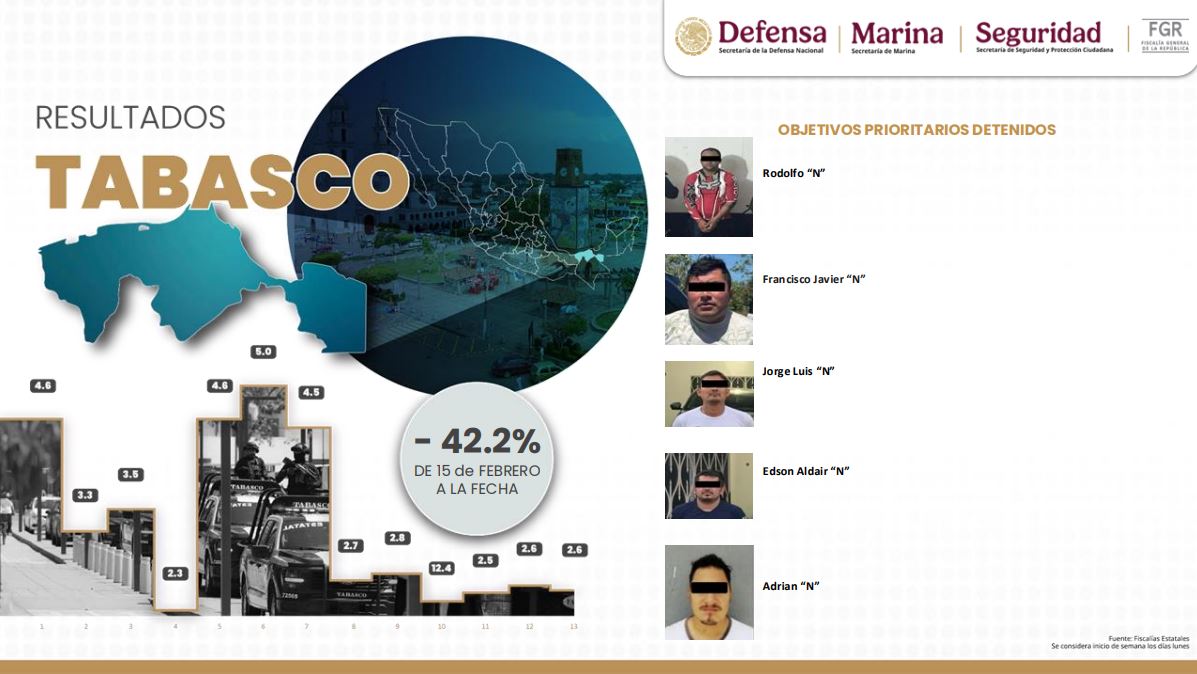 “Este despliegue permitió la captura de objetivos prioritarios vinculados a la violencia en la entidad, por lo que, desde el 15 de febrero a la fecha, se ha registrado una reducción de 42 por ciento en homicidios dolosos en Tabasco, lo que ha representado una mejora en la seguridad en el estado”, puntualizó.