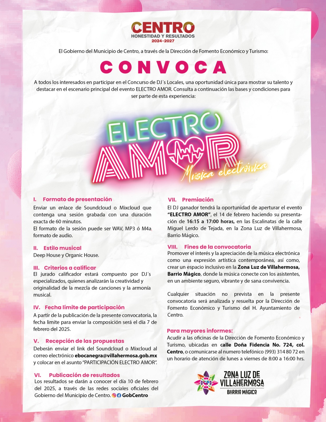 Con el objetivo de promover el interés y la apreciación de la música electrónica como una expresión artística contemporánea y crear un espacio inclusivo en la Zona Luz de Villahermosa, Barrio Mágico, el Gobierno de Centro convoca a participar en el Concurso de Disc-Jockey Locales, dentro del festival “Electro Amor Música Electrónica” a realizarse el próximo 14 de febrero.