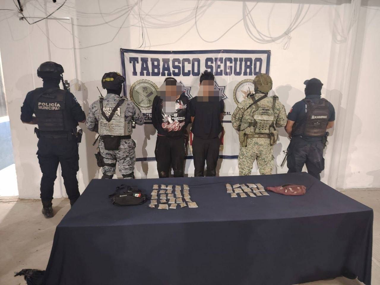 Un operativo conjunto de vigilancia y prevención por parte de fuerzas municipales, estatales y federales derivó en la detención de dos presuntos narcomenudistas en la cabecera municipal de Comalcalco.