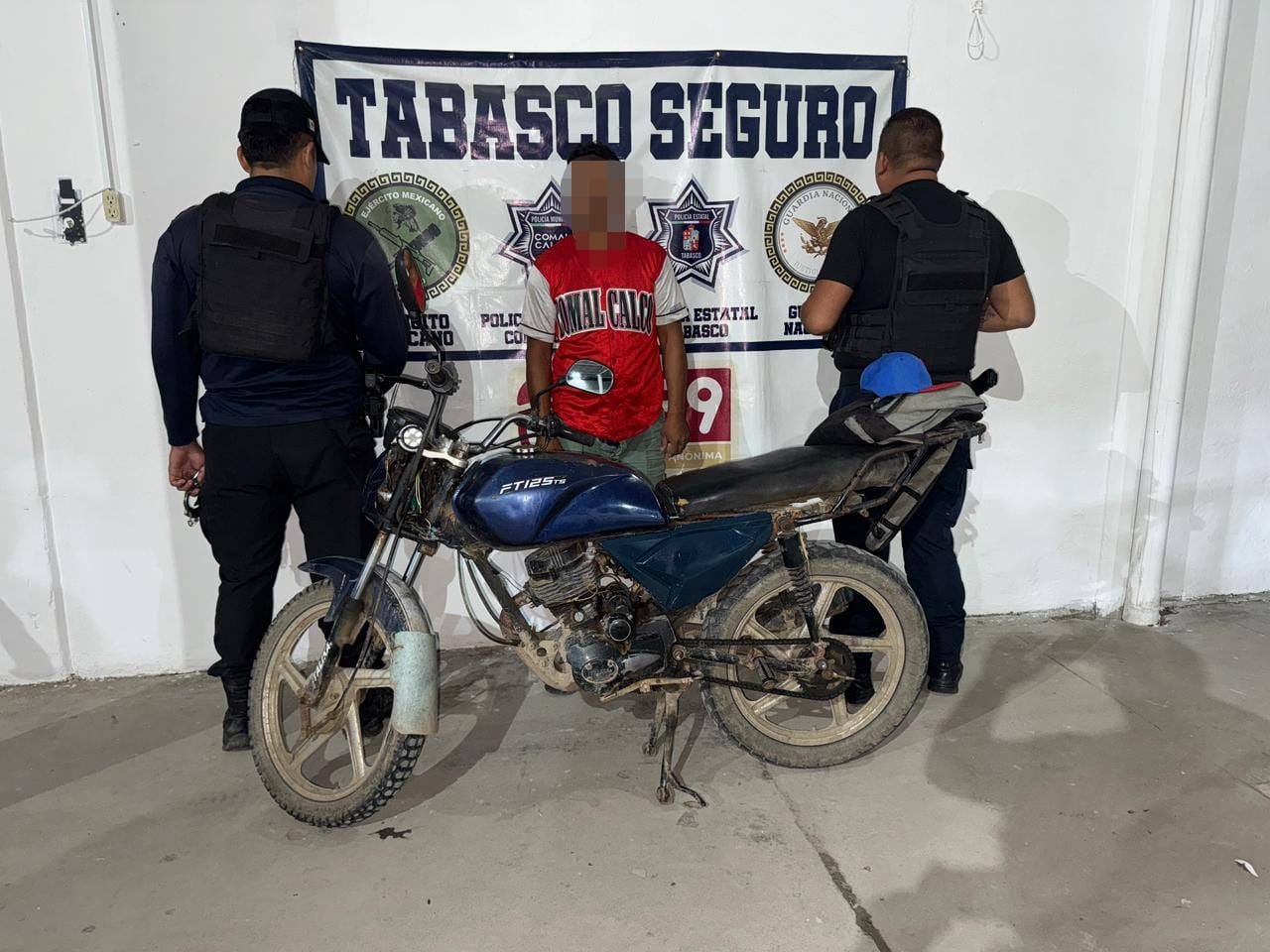 Elementos de la Dirección de Seguridad Pública Municipal de Comalcalco detuvieron a un hombre por la presunta posesión de una motocicleta con irregularidades en su número de serie, durante un operativo de vigilancia realizado en la ranchería Arroyo Hondo, segunda sección.