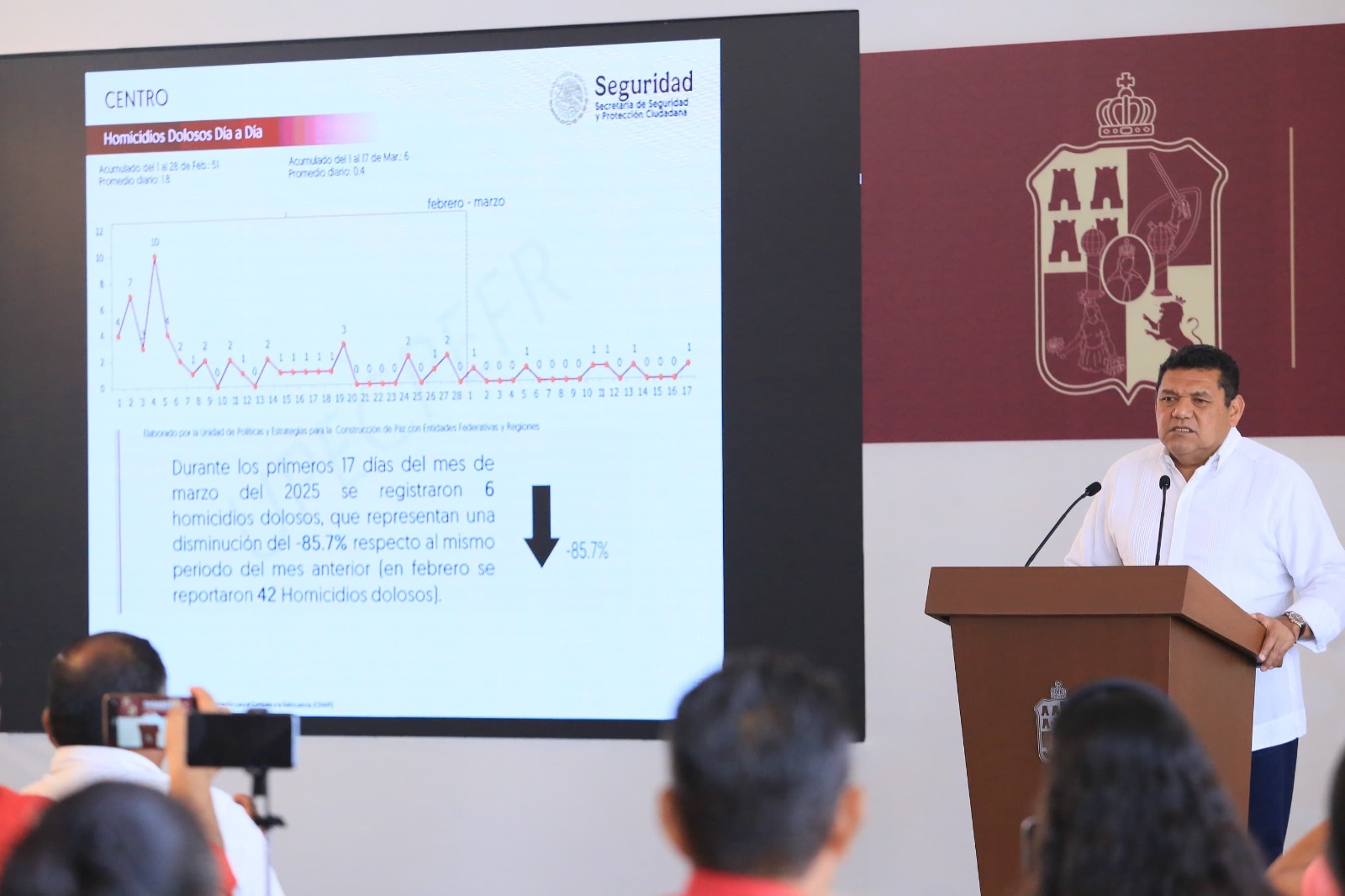 El Gobernador Javier May Rodríguez destacó este martes que los homicidios dolosos disminuyeron en 85.7 por ciento, en el municipio de Centro, como resultado de la nueva estrategia de seguridad instrumentada entre fuerzas federales y corporaciones del Gobierno de Tabasco, en la que hay más acciones de inteligencia.