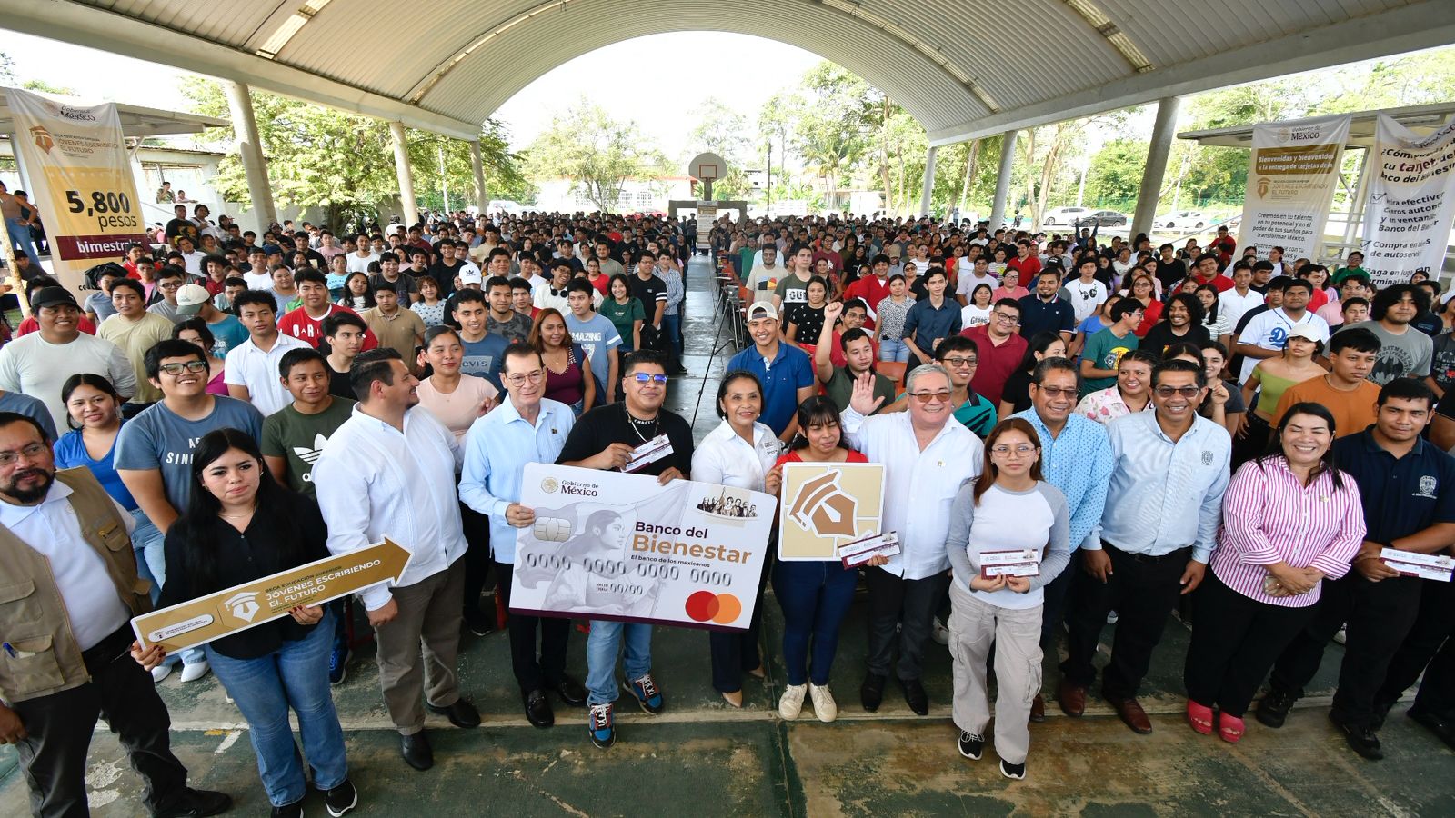 Un total de 967 estudiantes de la Universidad Juárez Autónoma de Tabasco (UJAT), fueron beneficiados con la entrega de tarjetas correspondientes a la Beca del Bienestar “Jóvenes Escribiendo el Futuro”, que se realizó en la cancha techada del campus Chontalpa, en el municipio de Cunduacán.