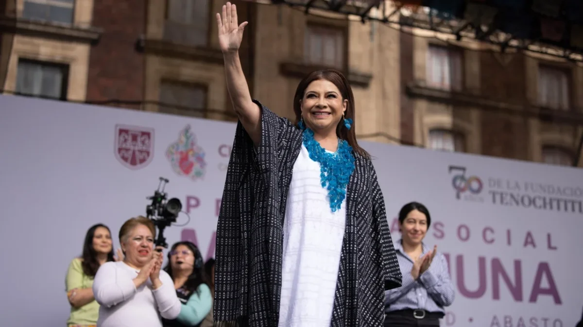 La jefa de Gobierno de la Ciudad de México, Clara Brugada, encabezó en el Zócalo capitalino la entrega de vales del programa Mercomuna a 25 mil personas, en su mayoría mujeres, quienes recibirán 2 mil pesos en vales para consumo en negocios locales.