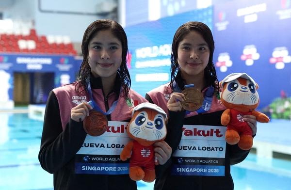 México sigue cosechando éxitos en el Mundial de Deportes Acuáticos Singapur 2025 y este martes logró un histórico resultado. Las gemelas Mía y Lía Cuevas subieron al podio en la prueba de trampolín sincronizado de tres metros, con una calificación de 294.36 pts, detrás de las duplas chinas (325.20) británica (298.35).