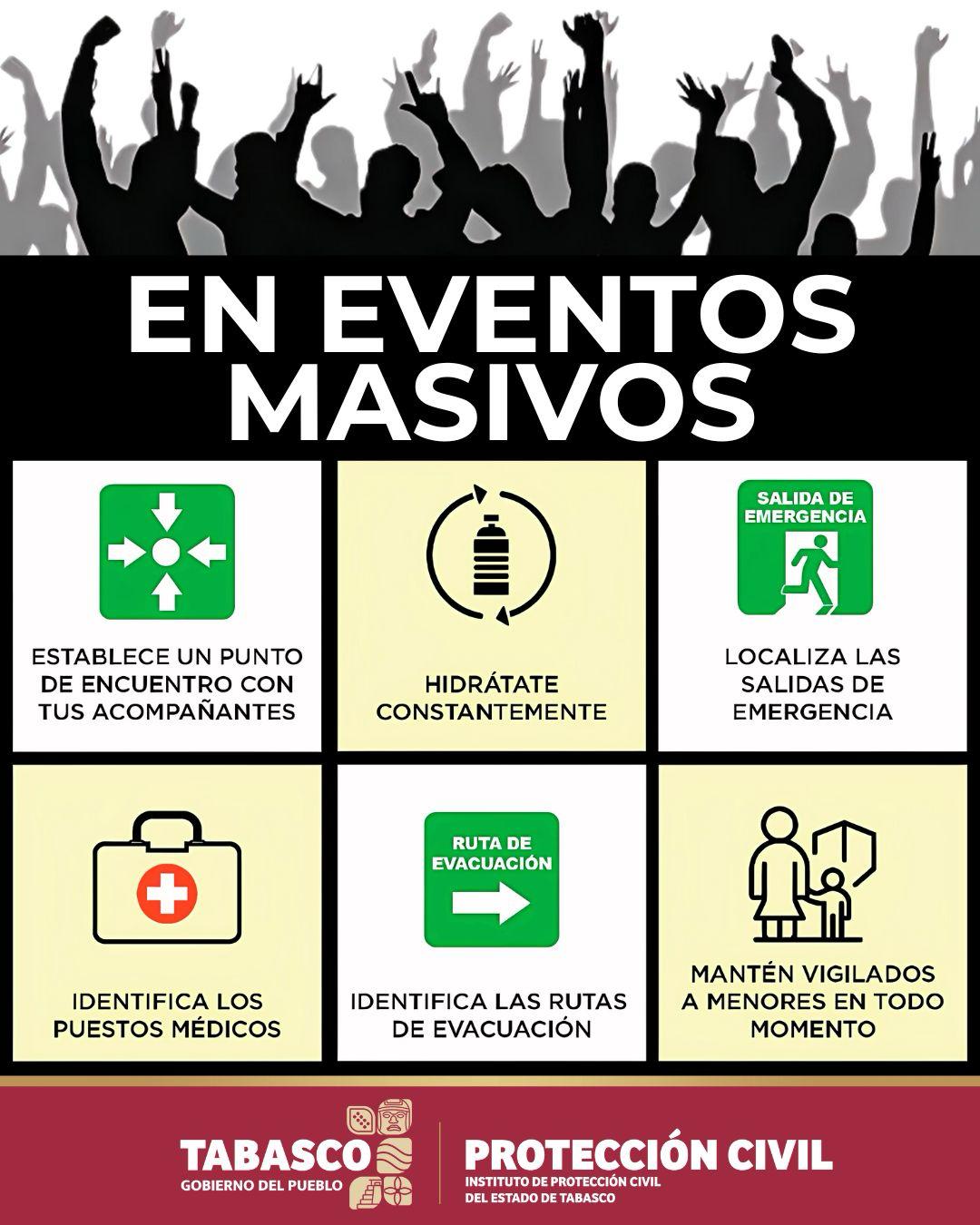 Asimismo, evitar llevar objetos punzocortantes o envases de vidrio, en caso de asistir con menores de edad, mantenerlos siempre bajo supervisión directa y en caso de extravío de personas, acudir al módulo de Protección Civil más cercano.