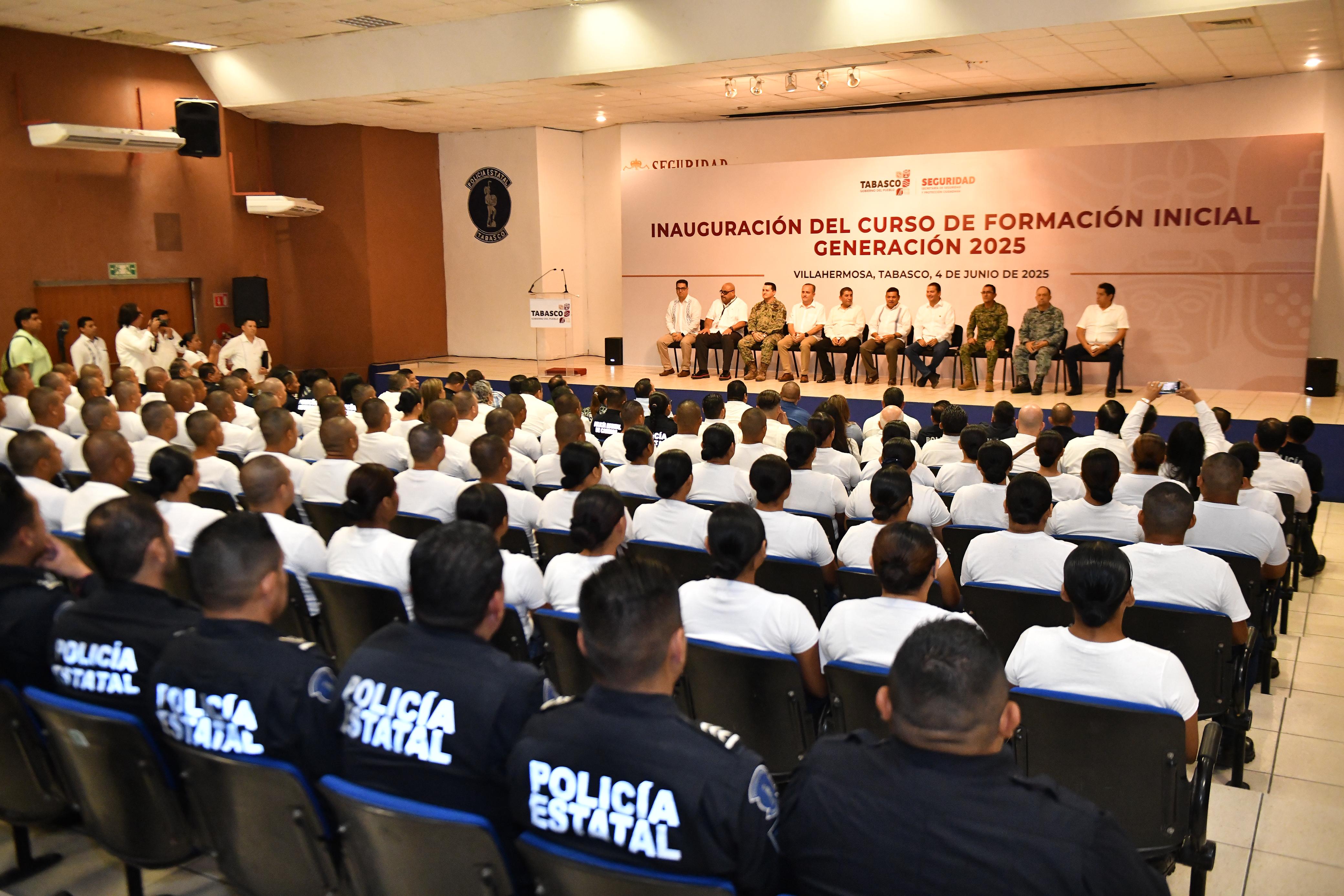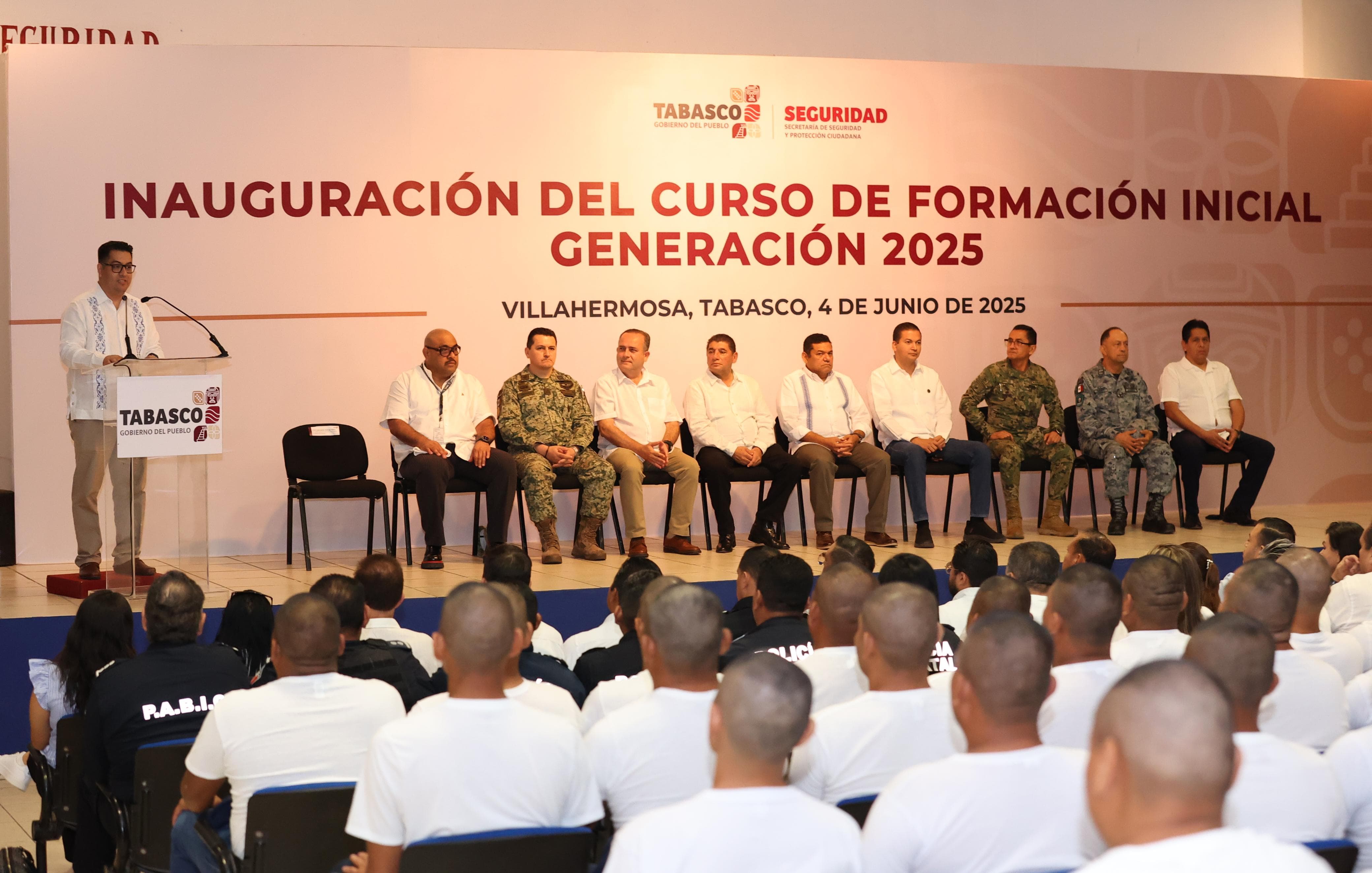 Javier MAl encabezar la inauguración del “Curso de Formación Inicial para la Policía de Proximidad” Generación 2025, el Gobernador Javier May Rodríguez destacó que el Gobierno del Pueblo trabaja para fortalecer la formación, profesionalización y certificación de los cuerpos policiales en la entidad; en estas capacitaciones participan 97 cadetes, quienes contarán con una beca mensual de 8 mil pesos, con el firme propósito y la convicción de servir a Tabasco.