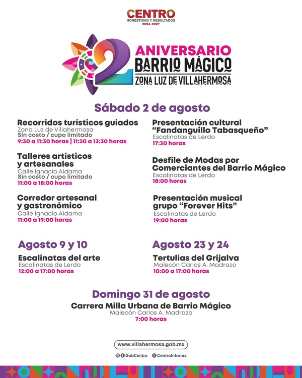El Gobierno de Centro invita a celebrar el segundo aniversario del Barrio Mágico de la Zona Luz con un programa gratuito que incluirá recorridos turísticos guiados, actividades artísticas y culturales, talleres, un desfile de modas, corredor artesanal y gastronómico, las Escalinatas del Arte, Tertulias del Grijalva y activaciones físicas. Las celebraciones iniciarán el sábado 2 de agosto.