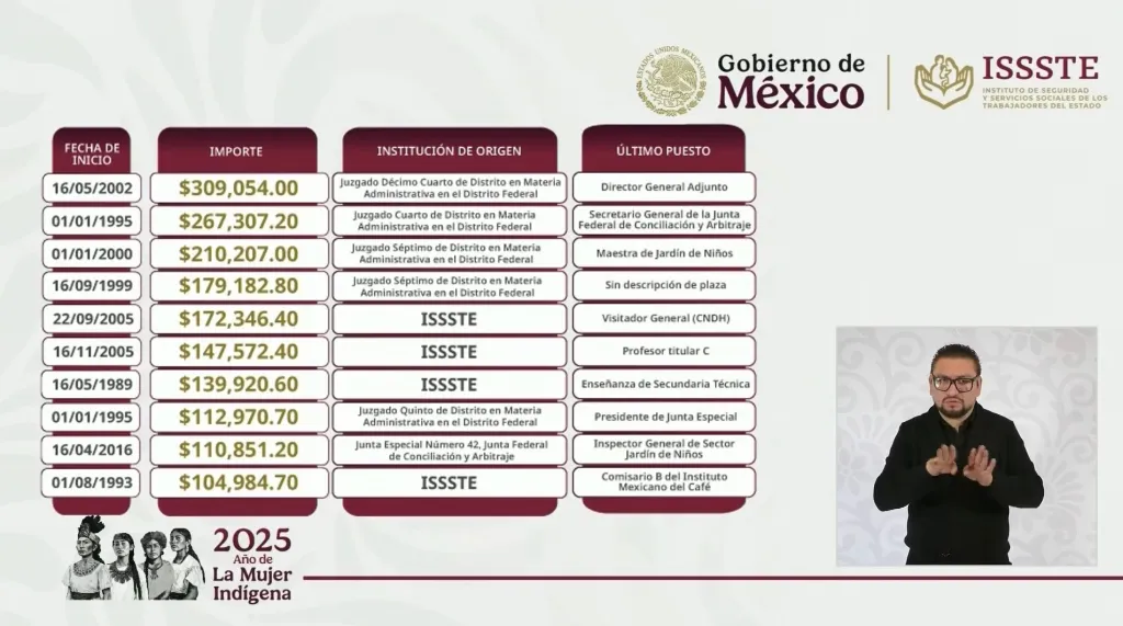 “Estas son las 10 pensiones más altas que hemos detectado, el límite máximo que marca la ley son 10 UMAS, que son como 34 mil pesos, pero -si ustedes observan- hay una pensión de 309 mil pesos que el ISSSTE paga desde el año 2002. De estas 10, como siete son superiores al ingreso de la presidenta de México”, sostuvo.