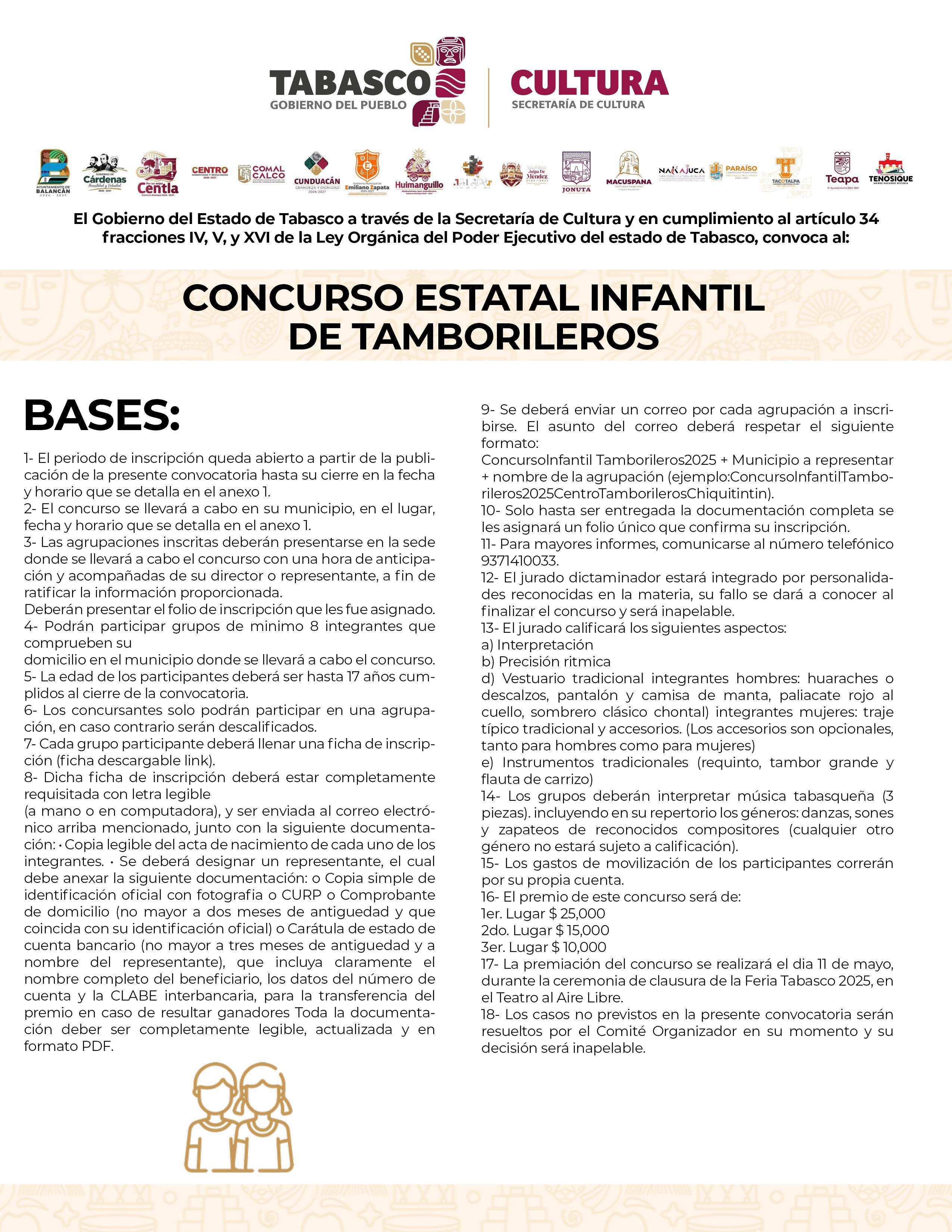 La Secretaría de Cultura del estado de Tabasco se complace en convocar a todas las agrupaciones infantiles de tamborileros a participar en el Concurso Estatal Infantil de Tamborileros 2025, un evento que busca preservar y fortalecer una de las expresiones musicales más representativas de nuestra identidad tabasqueña.