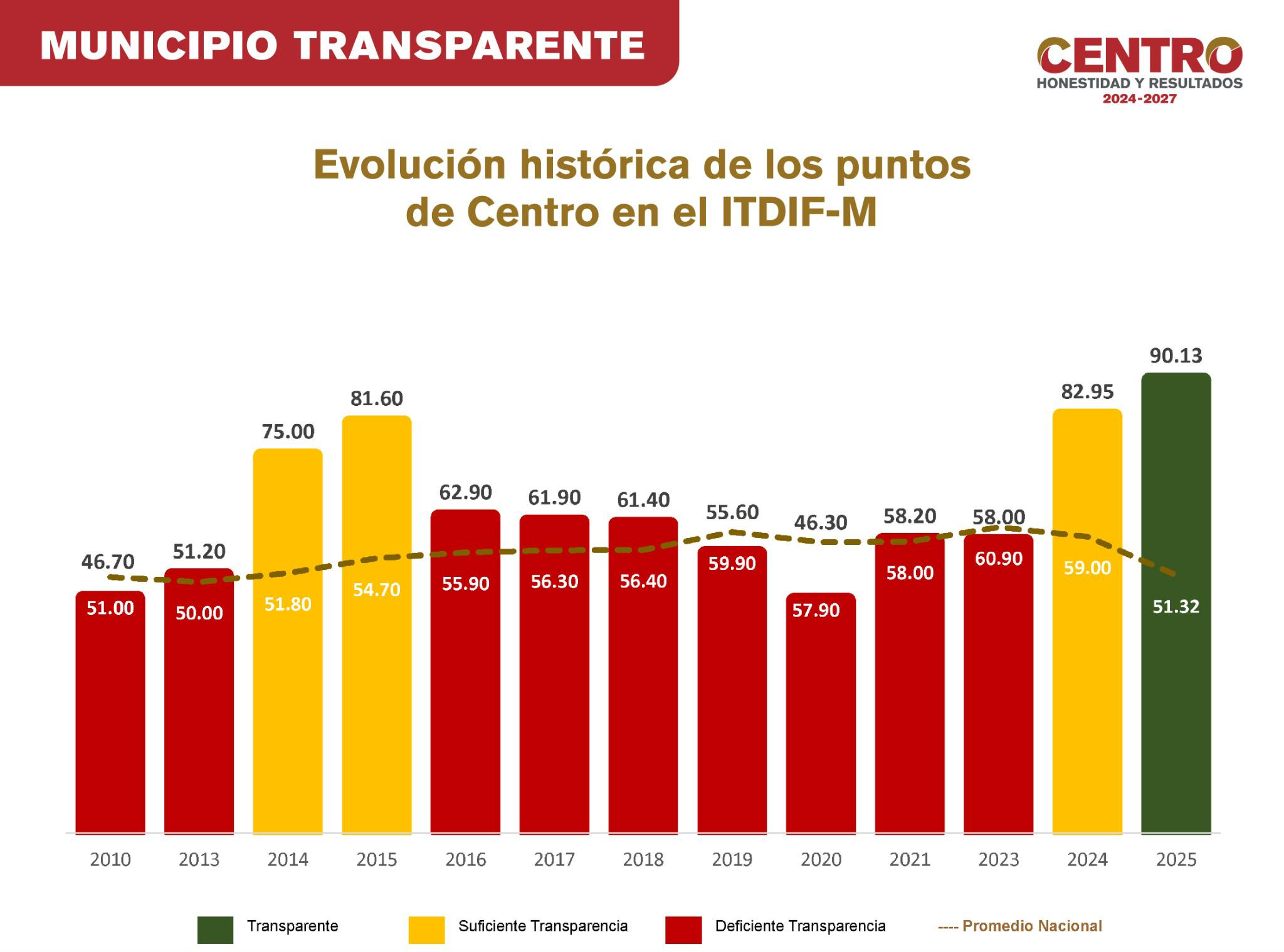 El municipio de Centro alcanzó por primera vez la categoría de \\\»Municipio Transparente\\\» en el Índice de Transparencia y Disponibilidad de la Información Fiscal de los Municipios (ITDIF-M), elaborado por región, con un puntaje superior a 90, situándose casi 40 puntos por encima del promedio nacional.