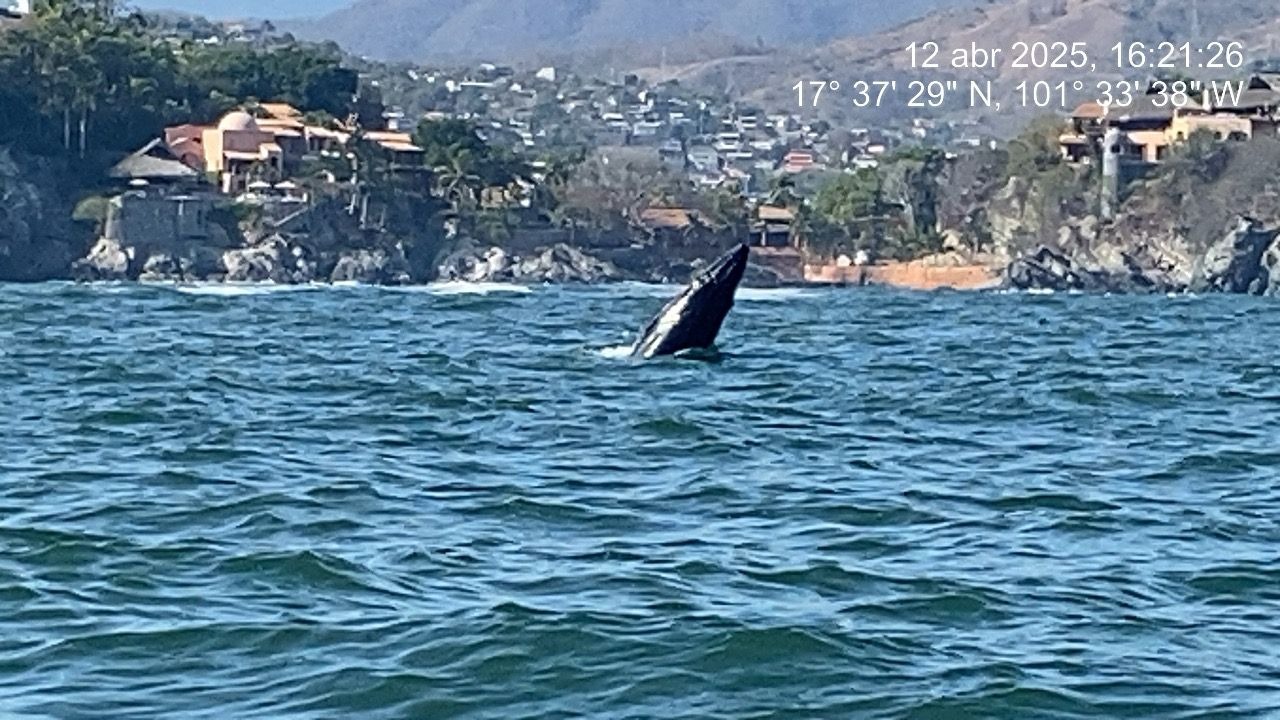 La Secretaría de Marina continúa el resguardo de una ballena jorobada y su cría, en Bahía de Zihuatanejo, Guerrero.