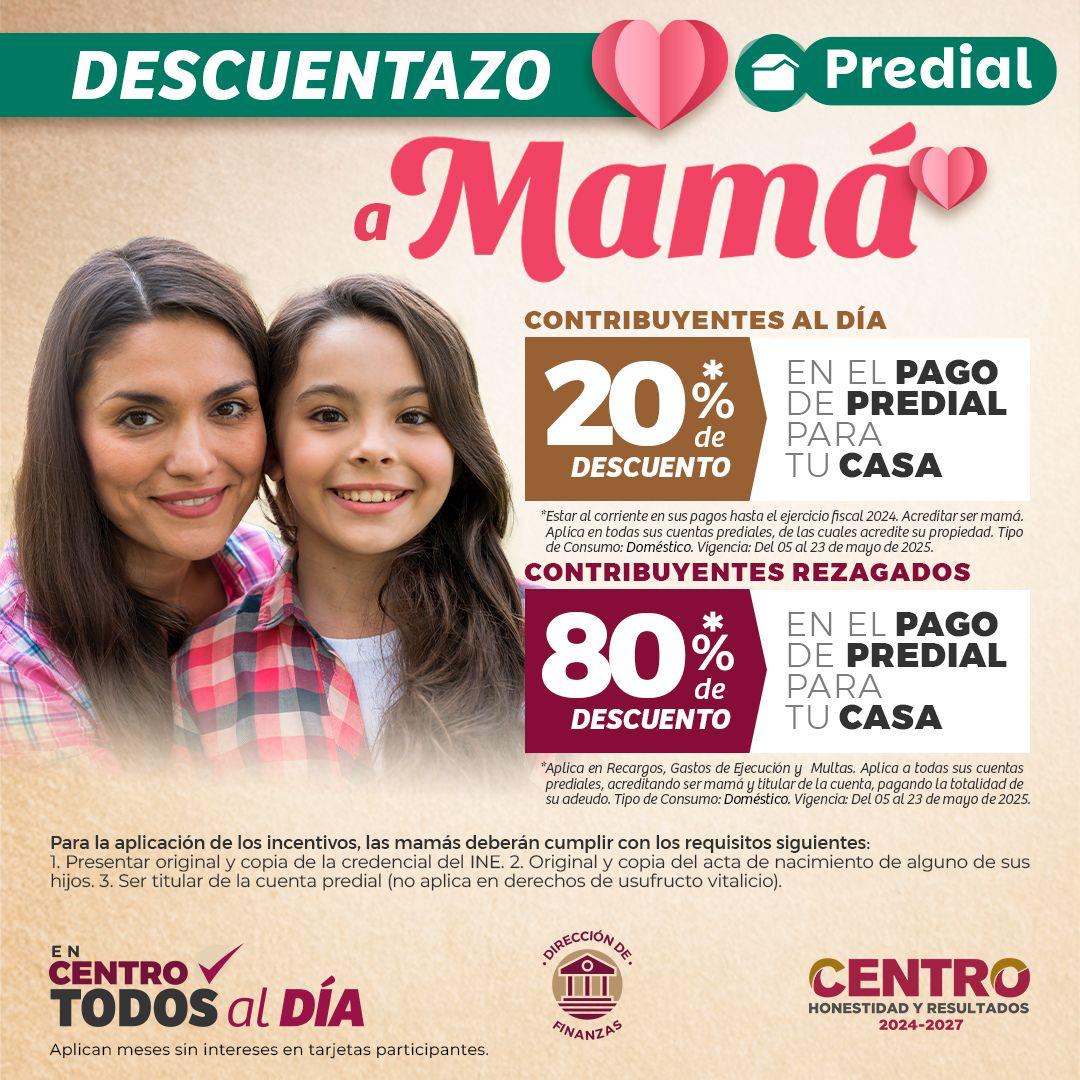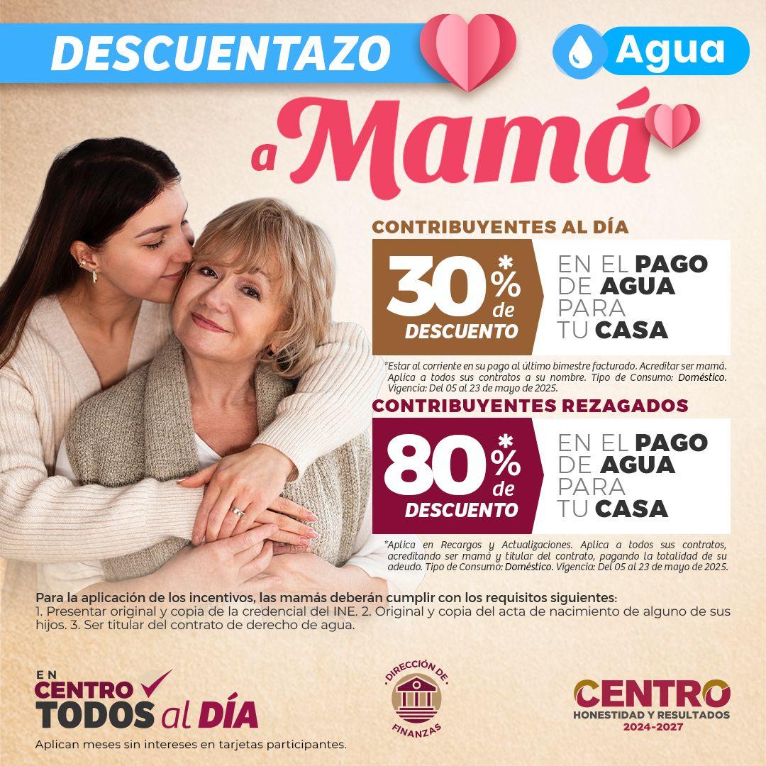 Con motivo de la celebración del Día de las Madres, el Gobierno de Centro autorizó incentivos fiscales para el pago del impuesto predial y del consumo de agua potable a todas las mamás que acudan de manera presencial a las cajas recaudatorias de la Dirección de Finanzas del 05 al 23 de mayo de este año.