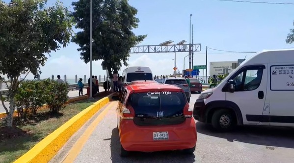 Taxistas de Ciudad del Carmen bloquean el puente Zacatal como protesta por la falta de operativos contra el transporte irregular en la isla.