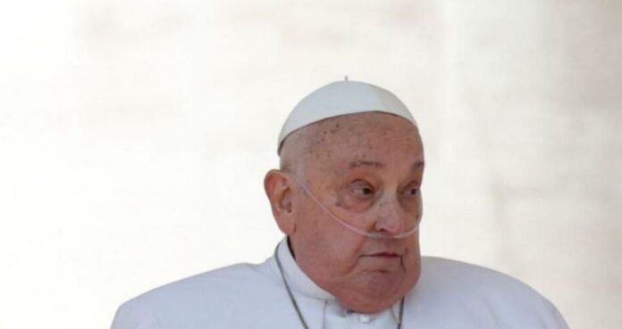 El papa Francisco apareció por sorpresa llevado en la silla de ruedas que ya usaba en el pasado por sus problemas de movilidad, recibiendo oxígeno a través de unas cánulas nasales y deseó una buen domingo a los fieles.