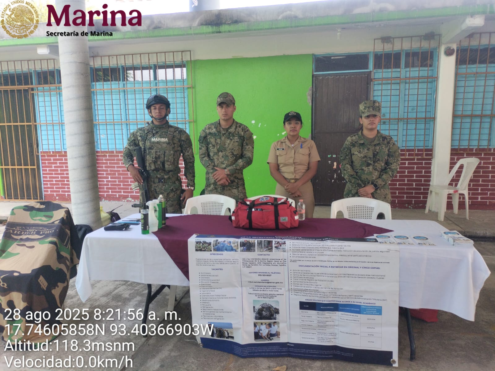 La Secretaría de Marina a través de la Armada de México, por conducto de la Tercera Región Naval, informa que, como parte del compromiso por la seguridad, el bienestar y la formación integral, personal naval participó del 26 al 28 de agosto 2025 en “Jornada de Paz” en coadyuvancia con la Secretaría de Seguridad Pública y Protección Ciudadana, en las instalaciones de la Escuela Primaria Rural “Noemí Pulido de Ochoa”, en Huimanguillo, Tabasco.