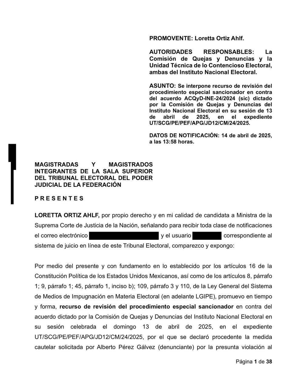 Hoy, en su calidad de candidata a Ministra de la Suprema Corte, Loretta Ortiz presentó un recurso de revisión en contra del acuerdo dictado por la Comisión de Quejas y Denuncias del INE, mediante el cual le ordenó retirar la publicación de su red social X, referente a la difusión del foro informativo llevado a cabo el pasado 30 de marzo.