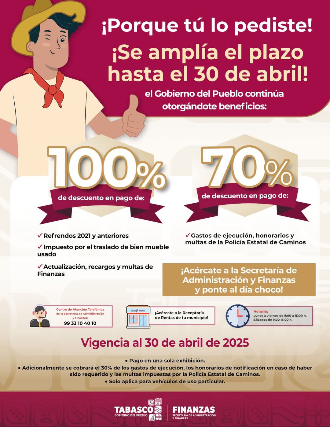 La Secretaría de Administración y Finanzas (SAF) exhortó a las y los tabasqueños para que aprovechen los incentivos fiscales que ofrece el Gobierno del Pueblo en el pago de refrendo vehicular, que durante este mes de enero es del 20%, además de la oportunidad de participar en la entrega de 50 Olmecabonos.