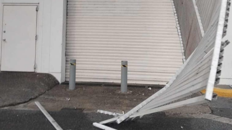 La pieza, que forma parte de la herrería del inmueble, quedó colgando peligrosamente en la parte trasera de una tienda departamental ubicada junto al periférico Carlos Pellicer Cámara.