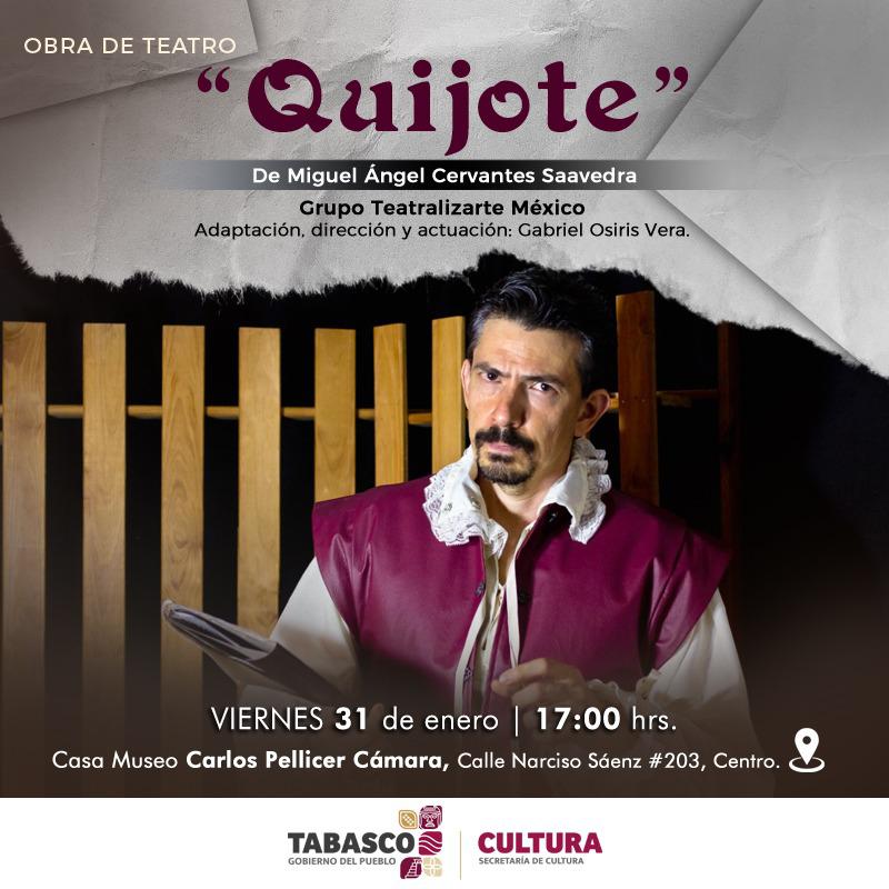 Este viernes, en la Casa Museo Carlos Pellicer Cámara, se presentará la obra de teatro “Quijote”, que dará inicio a las cinco de la tarde. Asimismo, el Parque Principal de la Villa Luis Gil Pérez, en el Centro, será escenario del Cine Itinerante, que se proyectará para los vecinos de la comunidad a las cinco y media de la tarde.