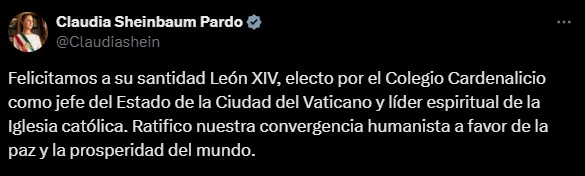 «Felicitamos a su santidad León XIV, electo por el Colegio Cardenalicio como jefe del Estado de la Ciudad del Vaticano y líder espiritual de la Iglesia católica. Ratifico nuestra convergencia humanista a favor de la paz y la prosperidad del mundo», escribió la primera mandataria mexicana en sus redes sociales.