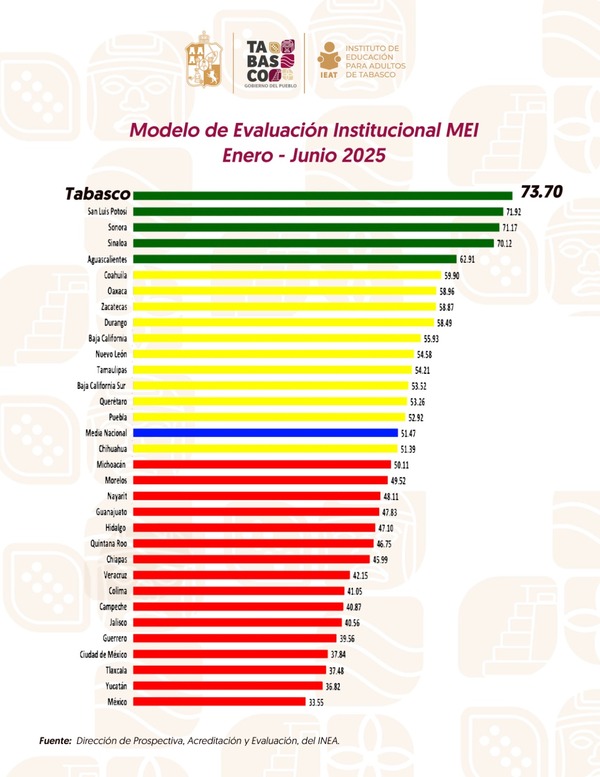 Tabasco se posicionó en el primer lugar a nivel nacional, de acuerdo a la más reciente evaluación realizada por el Instituto Nacional para la Educación de los Adultos (INEA), correspondiente al Modelo de Evaluación Institucional (MEI), con una puntuación destacada de 73.70 puntos, lo que demuestra el compromiso del Gobernador Javier May Rodríguez, de ofrecer servicios educativos  de nivel básico para jóvenes y adultos, promoviendo el desarrollo de sus capacidades e impulsar una sociedad más justa y equitativa.