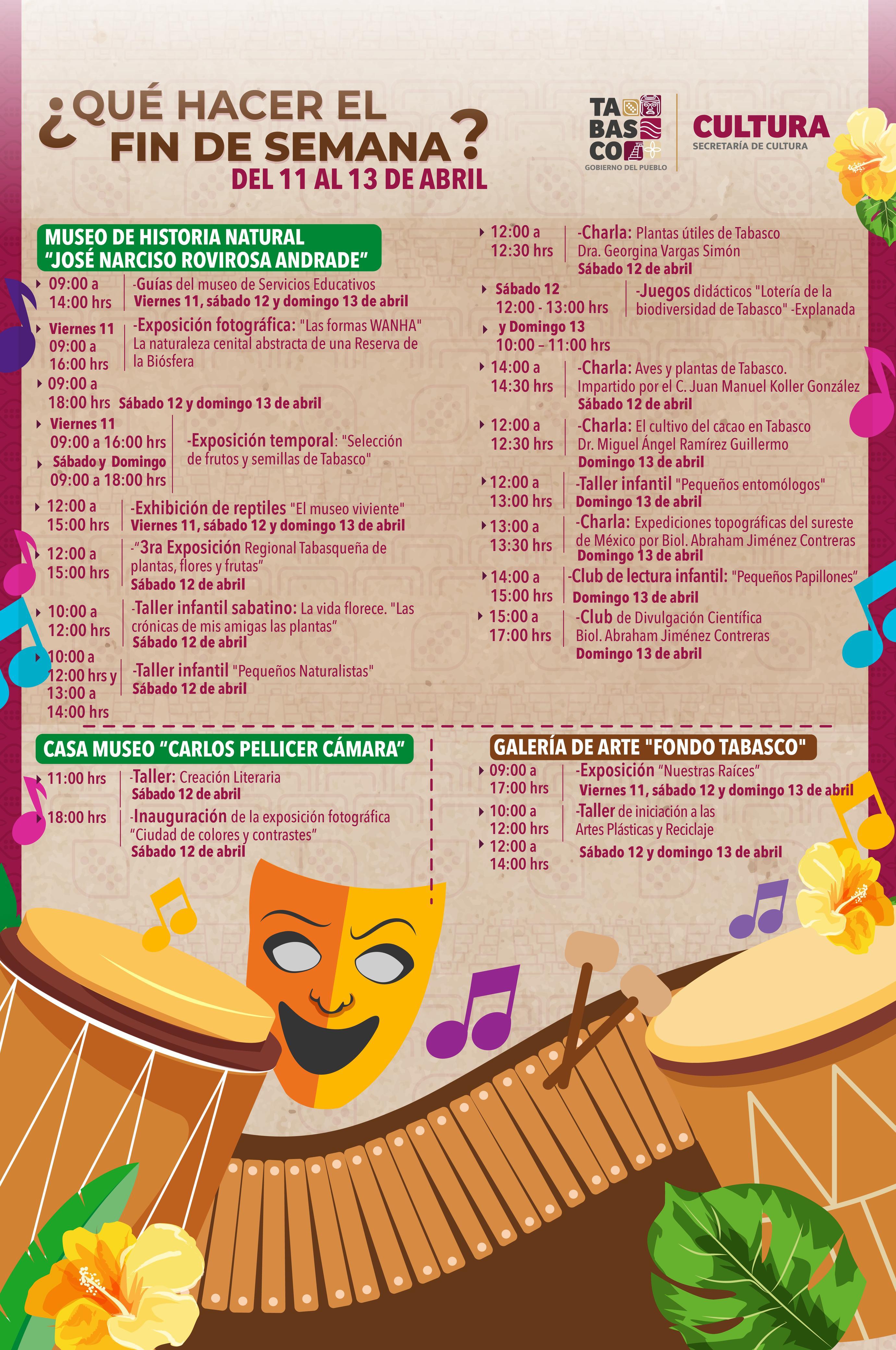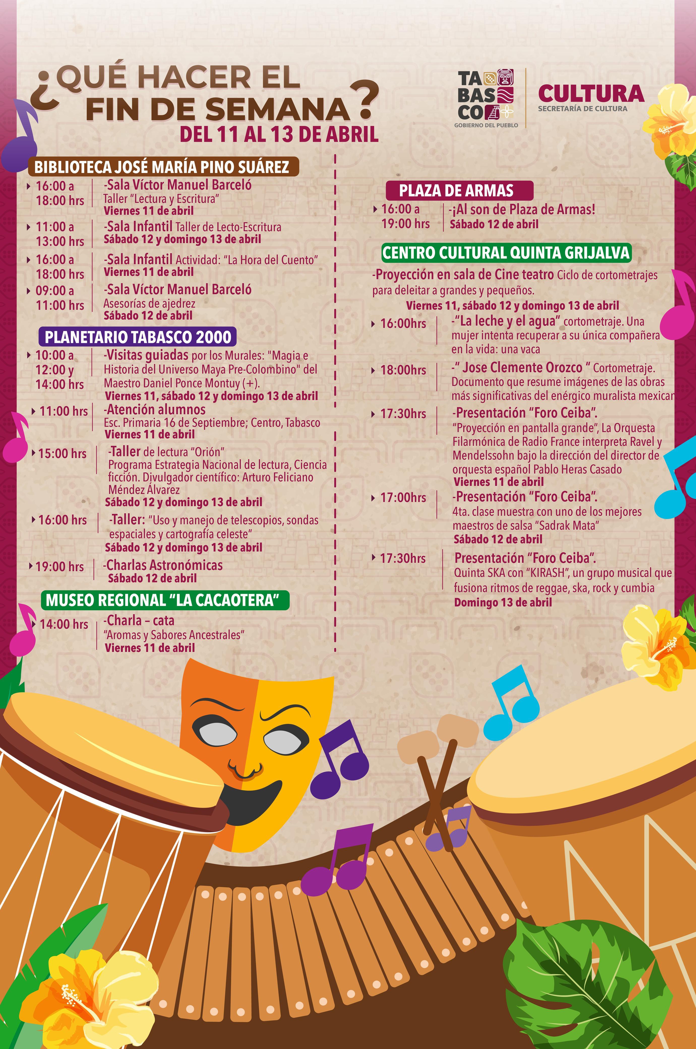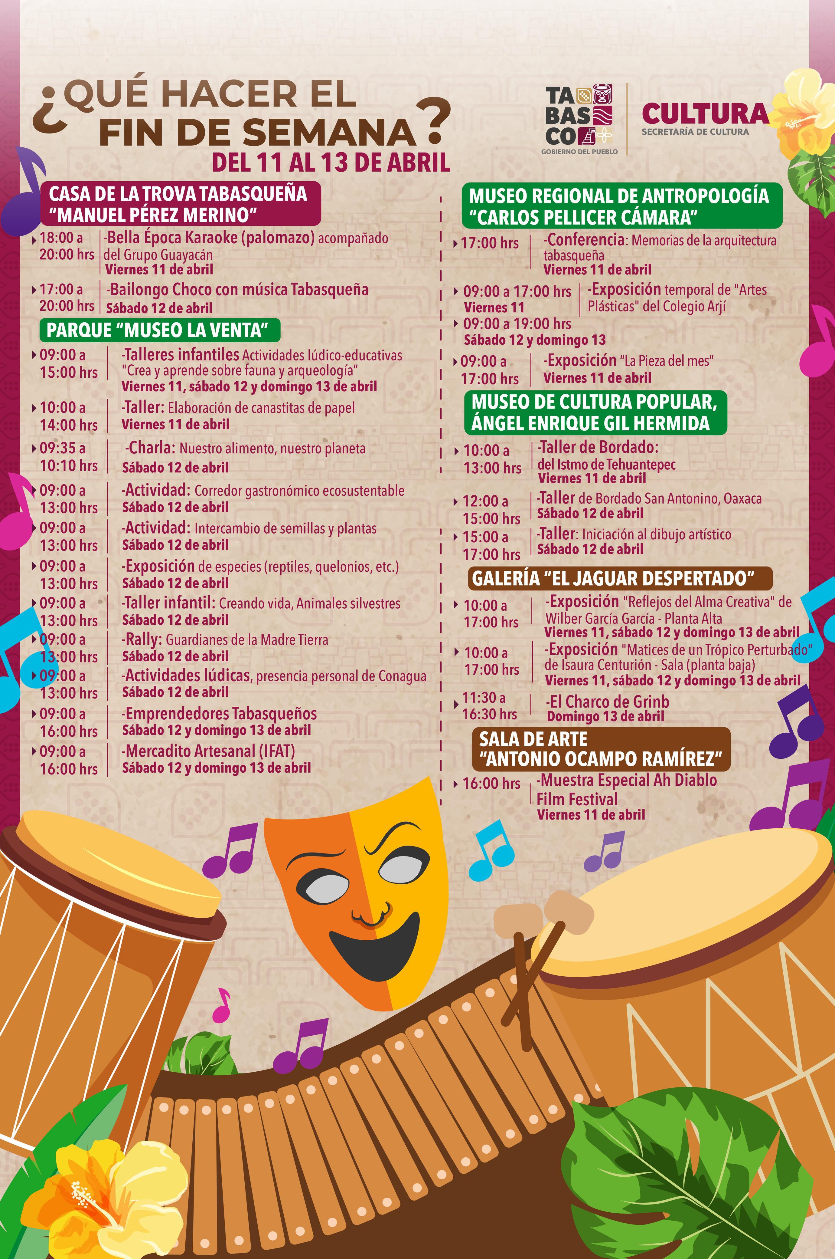 La Secretaría de Cultura de Tabasco presenta una cartelera imperdible del viernes 11 al domingo 13 de abril, con más de 70 eventos culturales y artísticos en todo el estado.